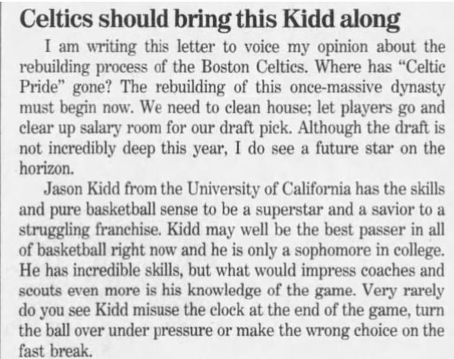 这名绿军铁粉当时给《波士顿环球报》写信,建议家乡球队彻底推倒重建,清空阵容名单,腾出薪资空间,通过交易提高选秀顺位,选择来自加利福尼亚大学的二年级后卫杰森-基德。